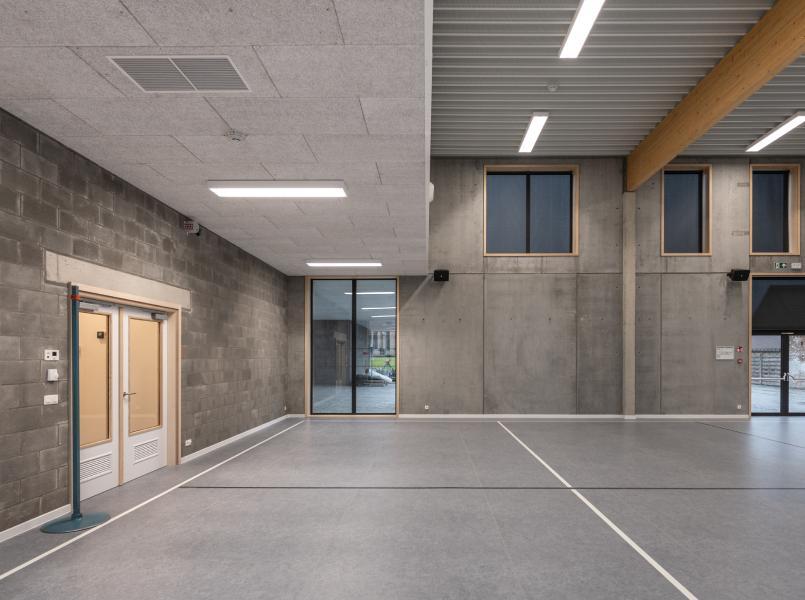 “Os edifícios da escola estavam em mau estado técnico e já não respondiam às necessidades da escola”, diz a arquiteta Delphine Bostoen. “As diferentes localizações também dificultavam o funcionamento da escola. Tanto as instalações sanitárias como o refeitório estavam muito desatualizados, havia a necessidade de um ginásio e também havia um problema de capacidade. A escola precisava de seis salas de aula novas, um ginásio com balneários, instalações sanitárias novas e uma zona de refeições com alojamento de apoio."